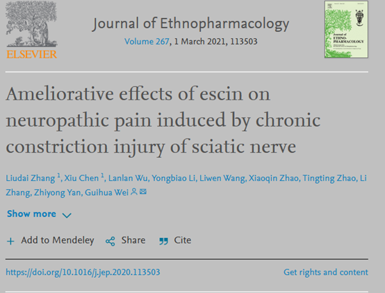 我院张留代硕士在JOURNAL OF ETHNOPHARMACOLOGY发表了题为“Ameliorative effects of escin on neuropat...