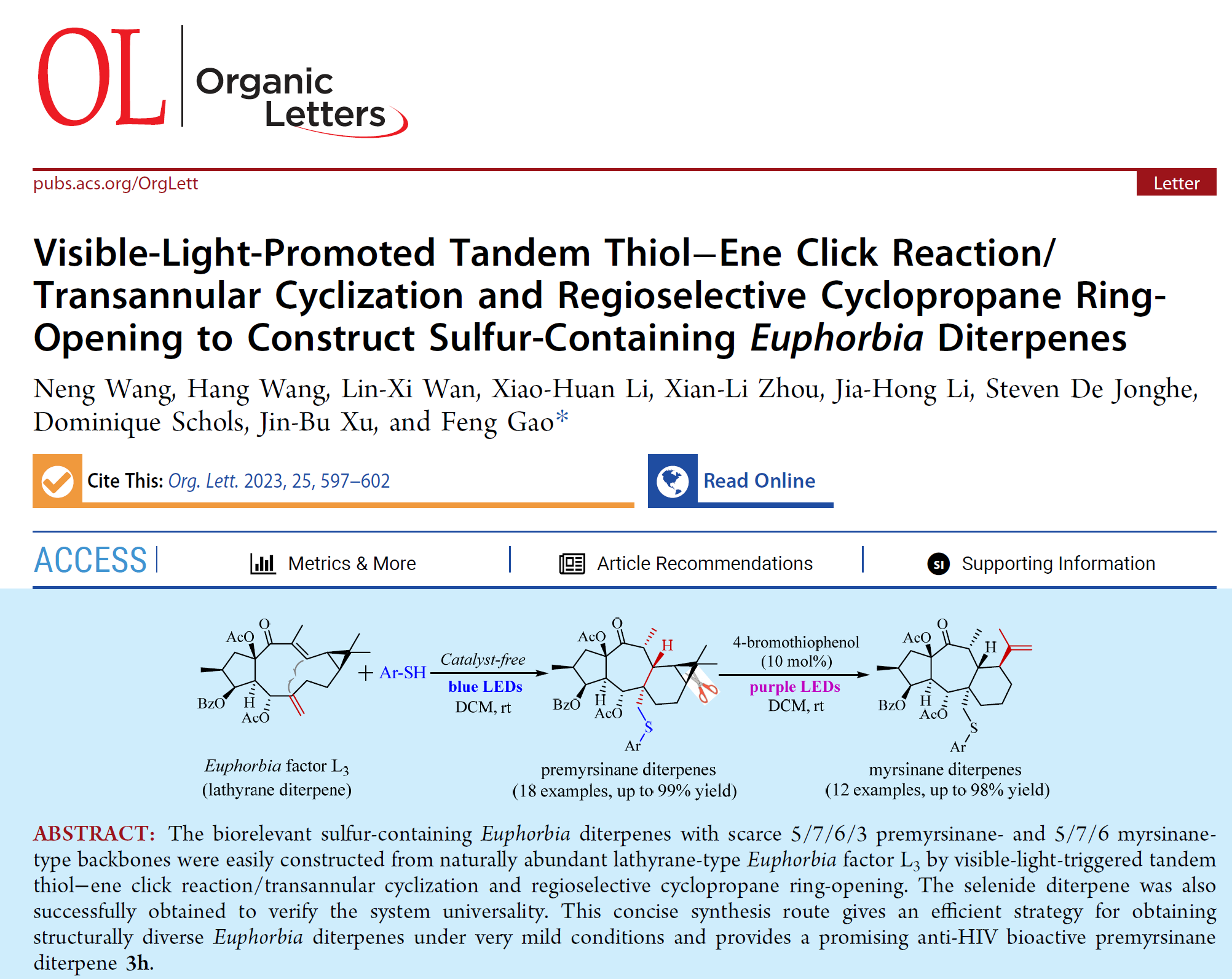 2023-02-11近日,我院高峰教授课题组在有机化学国际权威期刊Organic Letters(2023, 25, 597−602)上在线发表研究论文,报道了可见光催化的天然含...